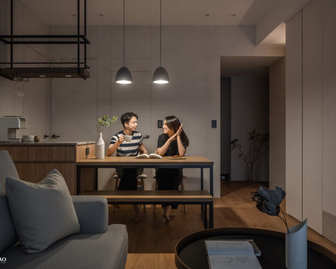 以低彩度奶茶色為主色調,搭配木質肌理與柔和光線,透過統一的色調、留縫造型及無框門,整合了公共空間有多個門的雜亂視覺。