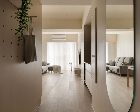 此案位於水岸邊,高樓層的自然採光替空間帶來明亮的優點,佐以塗料及暖色調顏料創造出溫暖舒適的氣氛。牆面大面積洞洞板除收納功能外亦兼具展示功能,可靈活運用增加個人風格。