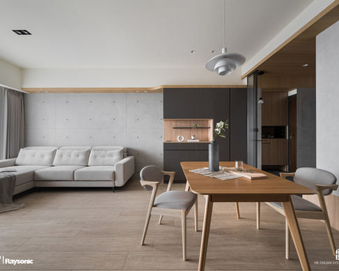 溫潤的木質與深色櫃體的沉穩,形成強烈對比卻又和諧共存,牆面搭配仿清水模的質感,為空間增添了幾分硬朗的氣息。玻璃隔間將空間劃分得井井有條,亦保持了視覺上的通透。格柵的設計不僅是空間的裝飾,更是光影的濾鏡,混搭風格讓整個空間充滿了個性與層次,營造出自然舒適的氛圍。