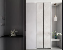 以現代冷冽灰階為基底,深色系櫃體搭配鐵件造型層板與鋁框玻璃門片,交織出俐落的線條,勾勒出輕工業風的內斂氣質。石紋鋪陳於牆面與櫃體門片間,帶來沉穩自然的視覺溫度。光線在灰色塗料牆面與鐵件間微妙穿梭,為空間注入柔和而清晰的層次。整體設計在剛柔之間取得完美平衡。