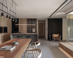 應用當代建築引景入室的自然視野,體現佇立在城市環繞居樓之中,亦能營造出的靜默。藉由機能轉折牆面的延續性,轉承場域於劃分空間,天地壁揉合了天然的材質設計,臥榻區框體有如鑲嵌於生活容器內,隱匿之間形成的包覆感,處於其中亦讓人感受其純粹,並達到局室安定的目的,伴隨著光影無暇肆意的渲染,讓生活居所入室既安,感受春耕秋收的四季變化。