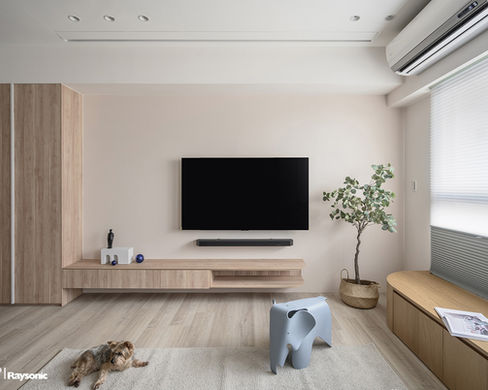 玄關區做了一整排櫃體,延伸至電視牆,溫暖木質色散發出樸質悠然的日式感