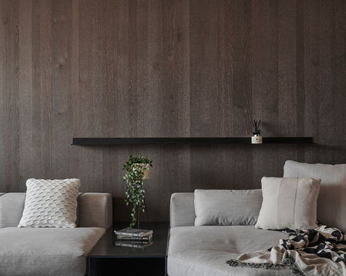 本案空間以沉穩的深灰木質作為基調,將其作為詩意的背景牆,從視覺上確立了內斂而堅定的空間主軸。這種大尺度的運用,不僅為居者帶來厚實的安全感,更創造出一個能沉澱心緒的靜謐領域。