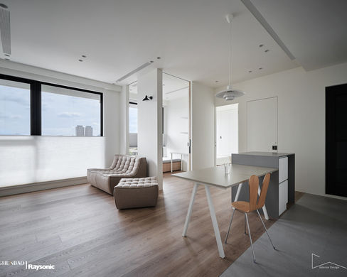 挑高的白色盒子,並打破制式化封閉矩形空間,創造出空間流動,當穿梭在此空間將會發覺,從環境到與人、與物件與光線等等都串繞著生生不息的能量,藉由空間的穿透,更讓家人在這個家的活動交集變得更加緊密熱絡 ; 模糊化空間界定,即想保有自我在書房休憩的時光,也能隱隱與客廳或餐廚空間的人保有連結的感受。