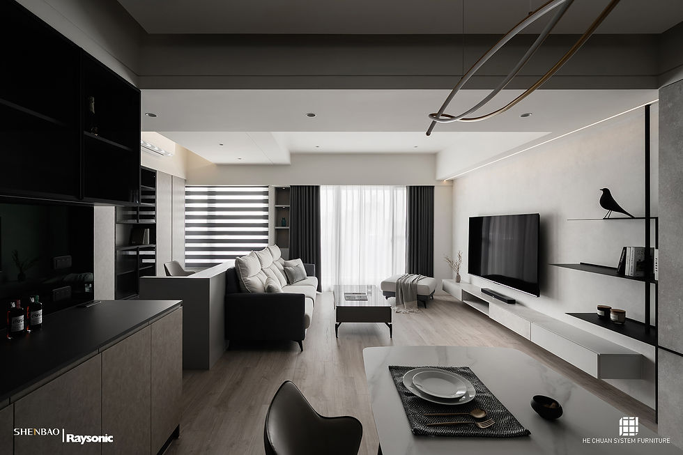 以現代冷冽灰階為基底,深色系櫃體搭配鐵件造型層板與鋁框玻璃門片,交織出俐落的線條,勾勒出輕工業風的內斂氣質。石紋鋪陳於牆面與櫃體門片間,帶來沉穩自然的視覺溫度。光線在灰色塗料牆面與鐵件間微妙穿梭,為空間注入柔和而清晰的層次。整體設計在剛柔之間取得完美平衡。