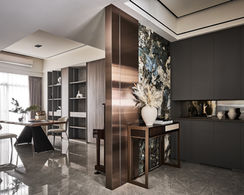入門玄關以屏風界定動線,大板磚如奢石紋理般流動,藍綠交錯的色調夢幻而高雅,結合鍍鈦板材,成為迎賓視覺焦點。開放式中島廚房整合餐邊與紅酒展示櫃,弧形語彙與燈條設計營造柔和氛圍,讓家人共享料理時光。
